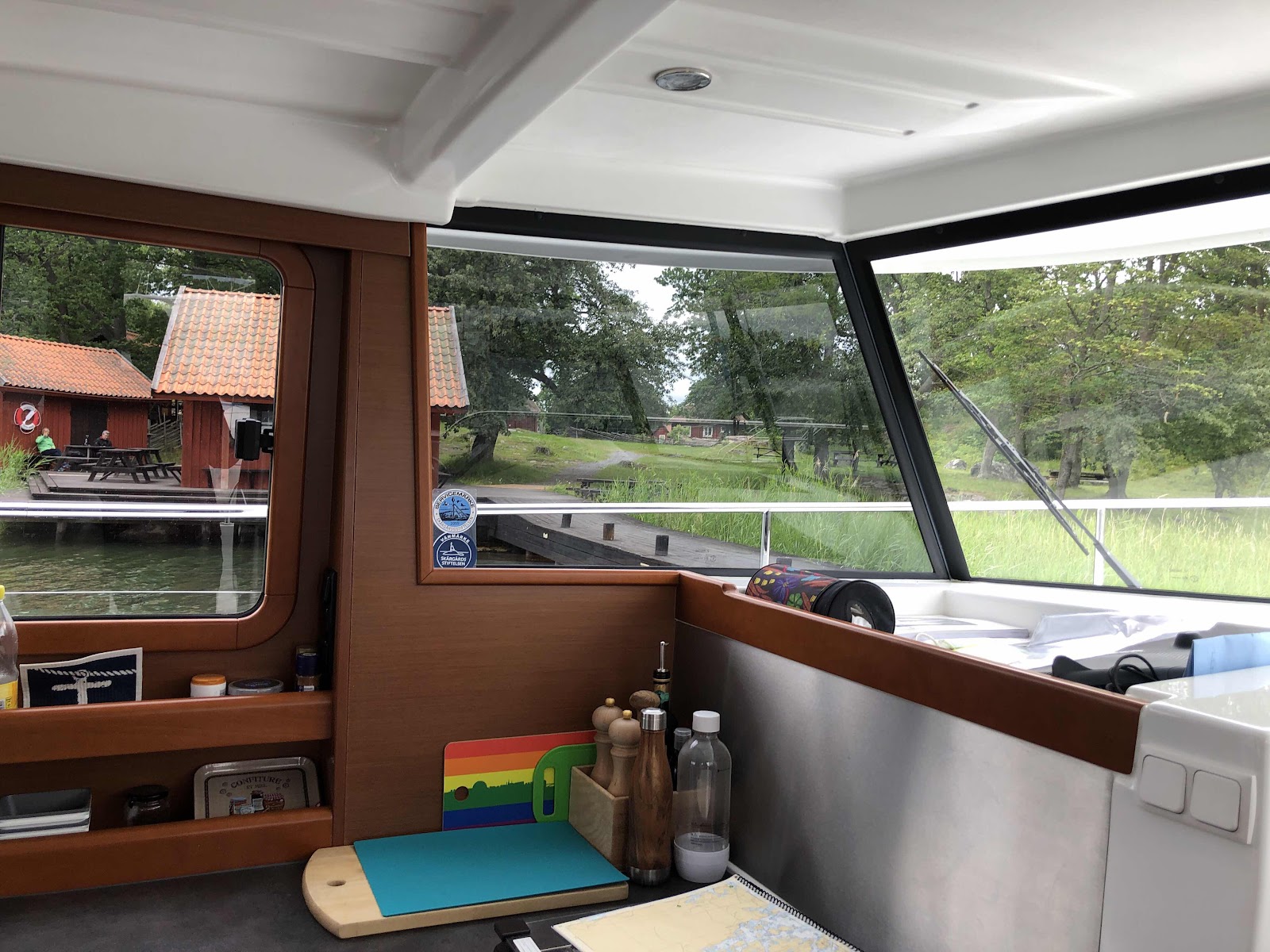 Från Högmarsö till Ängsö är det bara 3-4 distans. Ängsö är naturreservat och har en fin liten brygga på södersidan. Det blåste fortsatt 13-14 nordligt i byarna. Vinden snodde runt ön mer än vi räknat med så vi tvingades lägga en spring. Det fick vi sura kommentarer för från några segelbåtsägare. T och C gick en promenad på ön och jag påbörjade Skärgårdspusslet som vi fått av vännen J. I Norrtälje hade vi inhandlat en pusselduk som rullas ihop mellan pusselstunderna. Lite pensionärsvarning på den, men praktiskt.