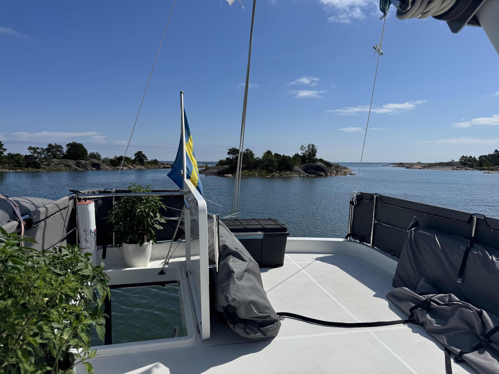 Vi hade hoppats på många bad i det 23-gradiga vattnet, men vid blåbojen i Kiddeviken var det algblomning. Vi hoppades att det skulle försvinna med den västliga vinden. Det var först till kvällen vi kunde bada.